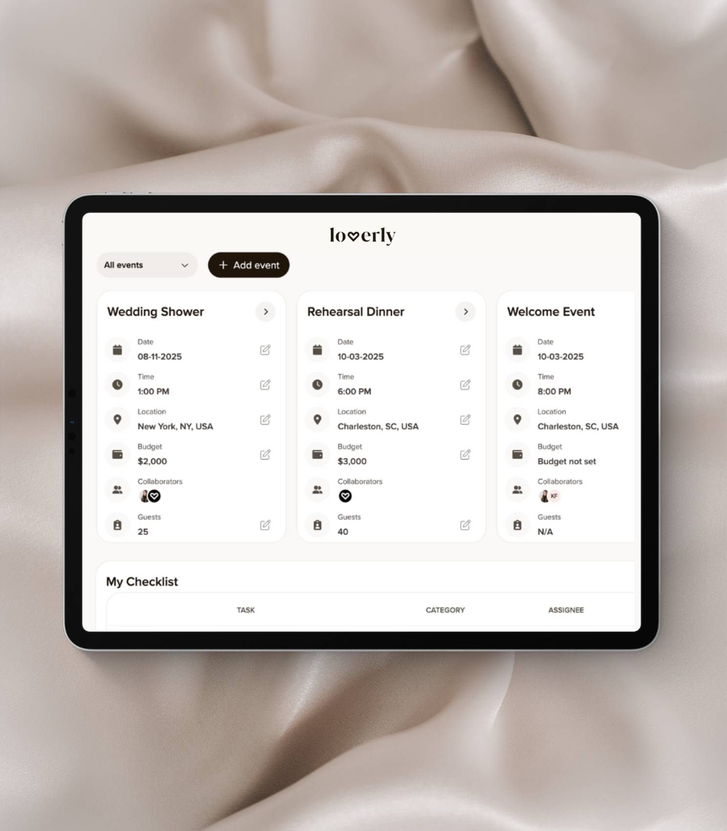 Loverly is more than just an online wedding organizer - it's your all-in-one planning destination. We offer a one stop shop where you can manage every detail in one place, from event budgets and checklists to guest lists and wedding vendors. Plus, we provide endless inspiration to bring your vision to life. With Loverly, planning is seamless, stress-free and completely free!