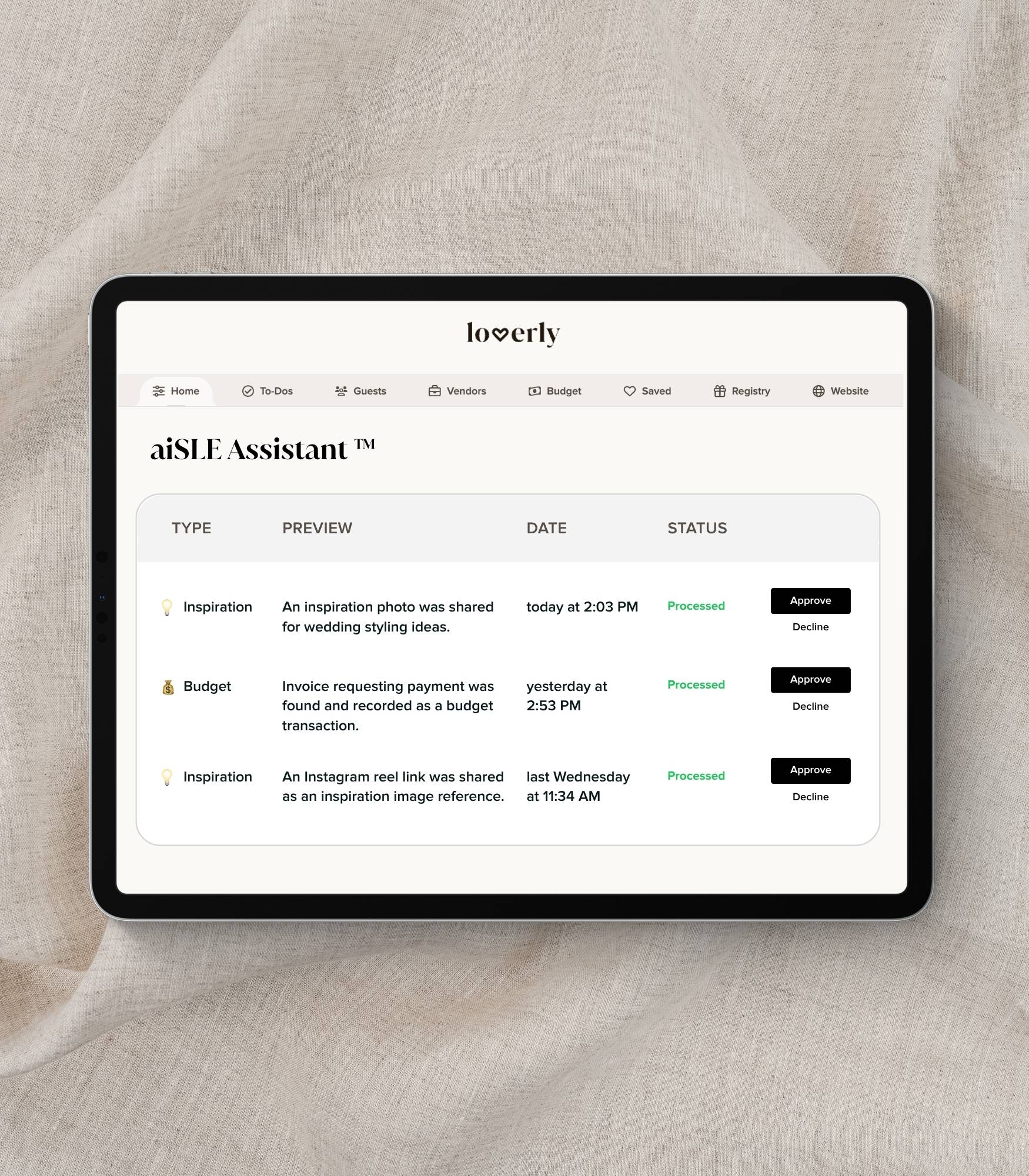 Vendor details, payments, guest names, and inspiration are each filed into the correct Loverly tool automatically. Your plan stays current without any manual work.